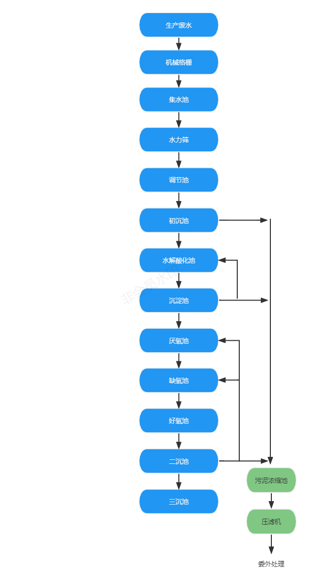 格柵+集水池+水力篩+調(diào)節(jié)池+初沉池+A2O+二沉池+三沉池