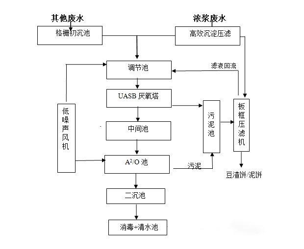 豆制品加工廢水來源成分:洗豆水、泡豆水、漿渣分離水、黃漿水、壓濾水以及生產工藝容器的洗滌水、地面沖洗水,另一部分廢水來自于大豆浸泡、洗滌及工作人員的生活污水。廢水中的主要污染物為高濃度的碳水化合物、蛋白質、脂肪等,還含有少量的食用油、辣椒、食鹽和食品添加劑。